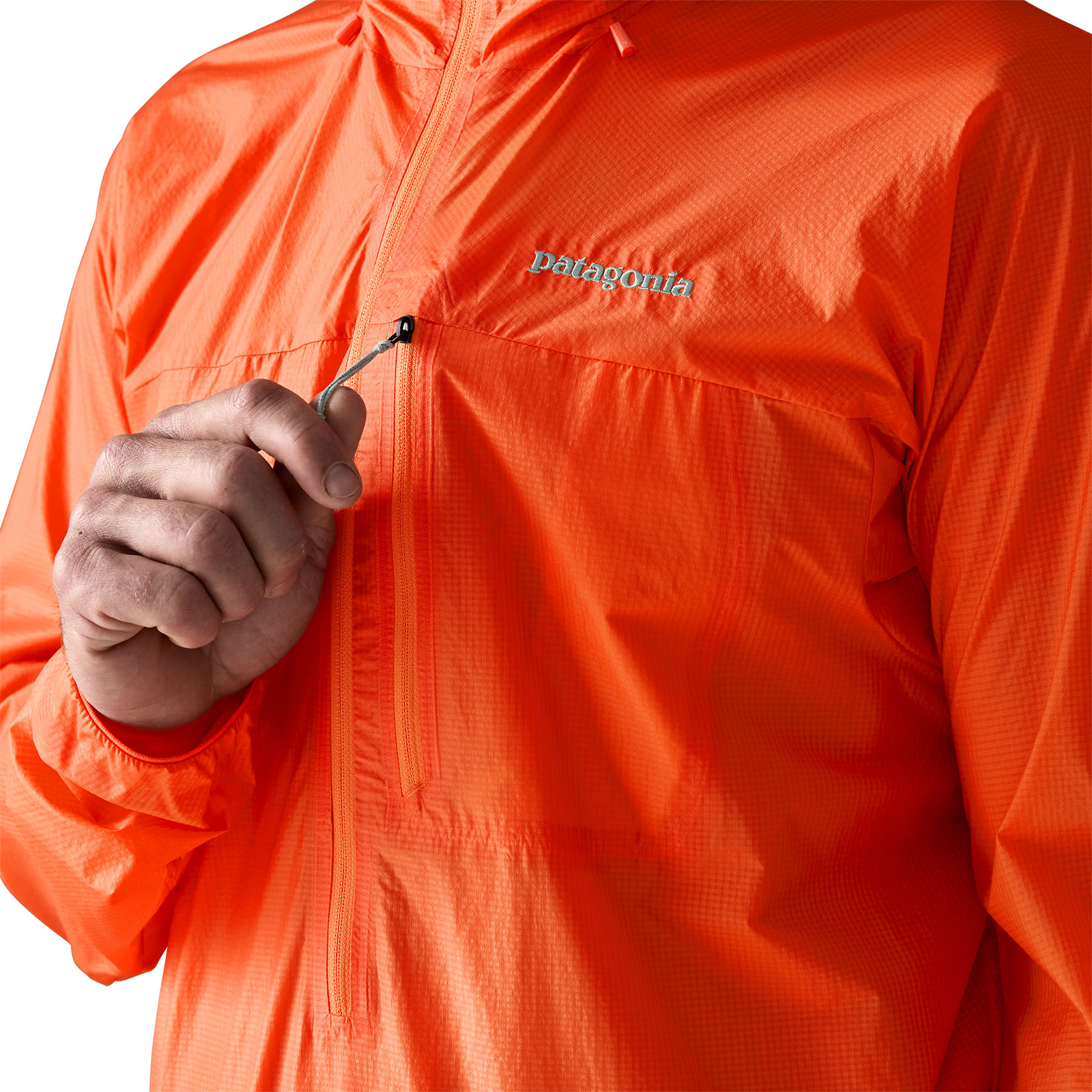 Качулка съвместима с каска и лесно сваляне – регулируема в две посоки, може да се сложи или свали с една ръка, дори когато якето е напълно закопчано. Тясната, катераческа кройка осигурява допълнително пространство в раменете за свобода на движение над главата, а дългият централен цип позволява лесно обличане и събличане или бързо проветряване при интензивно катерене.